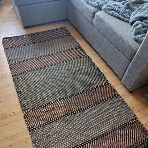 Blå tæppe. Ca 80 cm bred og 240 cm lang.