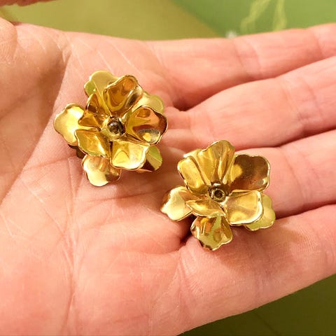 Originale øreclips fra 70’erne med masser af små blomster syet på en messingbue. Brug dem som de er eller slagt dem og brug delene til nye projekter. Cirka 3 x 2 cm. Lidt mørknen af metal og en smule ir på nogle. Jeg har flere par 😊