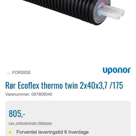 2 rør på 35 m og et på. 37 m incl. samlemuffe og koblinger så det kan bliver et godkendt rør på 72 meter incl. 2 ventilsæt og ende afslutninger. Begge rør er nye og aldrig taget i brug fabrikat Logstor sælge samlet