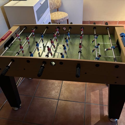 Fint bordfodbold spil. Der mangler en skrue på en enkelt eller to spillere men ellers helt klar til leg. Der følger to bolde med