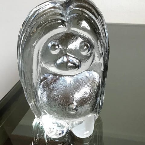 Bergdala troldefigur (med hale) i glas Måler 8x6cm og er 9cm høj . Vægt 535g. Flot stand uden skår eller revner.