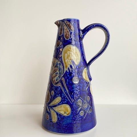 Der er 2 store lerfade, en kande, en krukke og en sovse skål. Ler fadene er 28 cm og 21 cm i diameter.