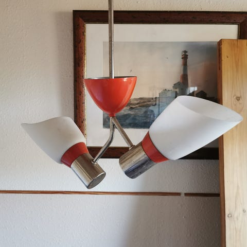 fra 60 erne, hvid/rød metal med plast inder skærm. Den er blevet spændt for meget, så skærm er let revnet, er blevet limet og fået en læder lap på skærm. (derfor den lave pris)