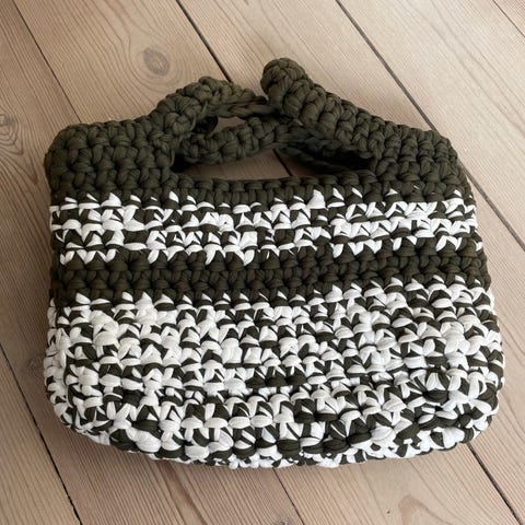 Jeg har hæklet denne super fine taske i dobbelt bomuldsgarn.Den er monteret med gamle bambus håndtag med messing skinner. Tasken måler 35x30cm og hanken er 25x15 cm. Den perfekte sommer taske. Sender gerne på købers regning