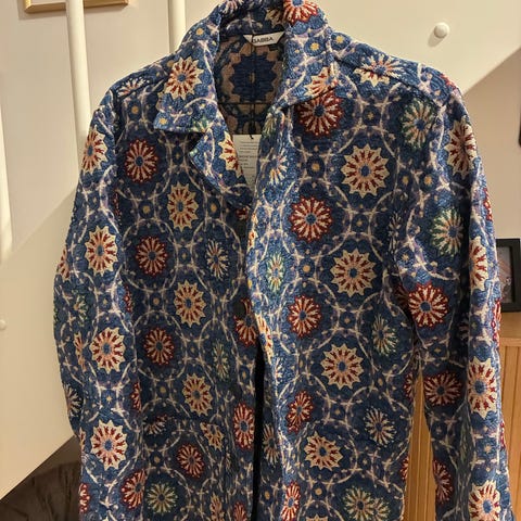 Rigtig flot Jakke fra Gabba i str. M. Har en speciel overflade i polyester med en mat effekt. Én af knapperne er syet på igen, men det ser man ikke, og jakken er ellers som ny!