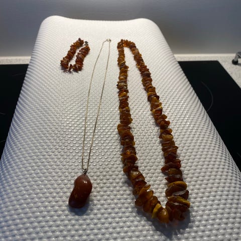 Sæt af halskæde, armbånd og øreringe i rav
