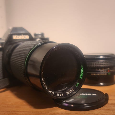 Konica, FP-1, God, Konica FP-1 analogt spejlreflekskamera med Konica 135 mm zoom linse i etui og ekstern Braun 400 M Logic blitz. Der følger en taske med til kameraet. Der er lige sat nyt batteri i kameraet, og det klikker som det skal. Kameraet har altid været opbevaret ved stuetemperatur, og har ikke været udsat for fugt.