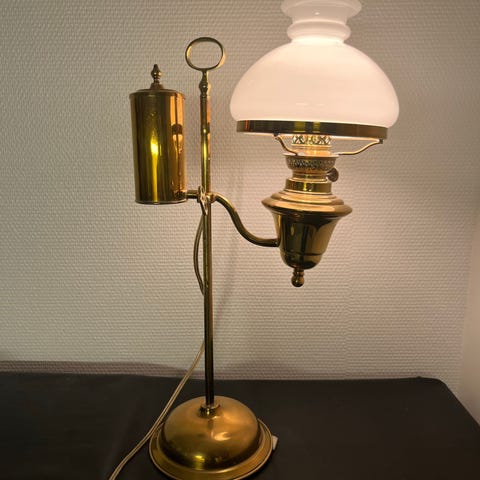 Glas i let mattering og messing fod inkl lille bule. Flot antik lampe i messing med glasskærm.