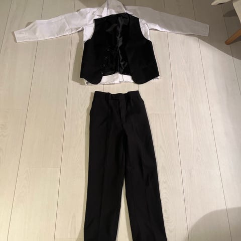 Jakkesæt bestående af jakke, vest skjorte og bukser. Der står str 64 i, jeg vurdere at det passer en 10-12 årig. Meget flot sæt.