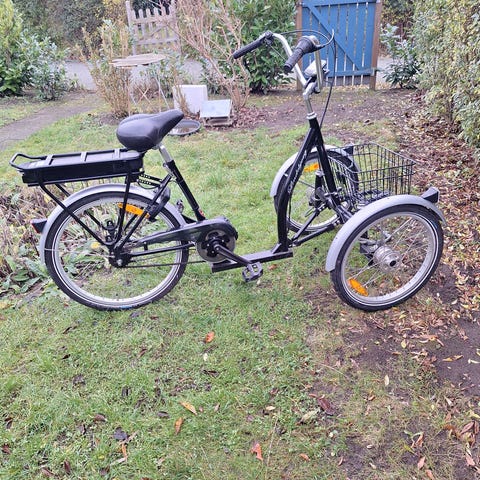 Sort trehjulet elcykel med bagagekurv bagpå. God til dem, der har lidt problemer med balancen.