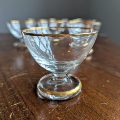 Dessertglas med guldkant og guldstreger.