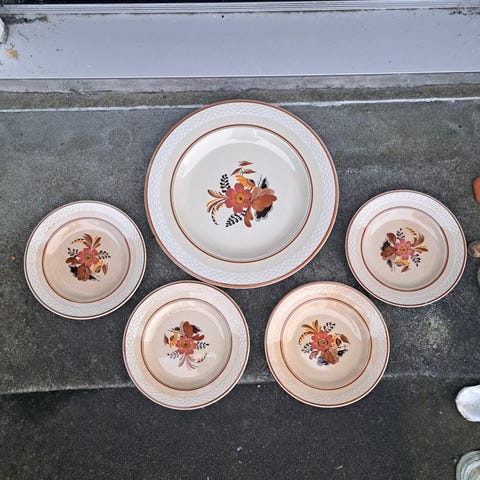 Aluminia tallerkener 8 stk, 6 med dia 21 cm, 2 med dia 19 cm, 2 af tallerkenerne har lidt krakelering, salt - peber - sennep sæt på fad, lille kande H 9,5 cm, 2 smørbrikker dia 15 cm. Sælges kun samlet.