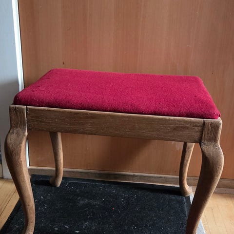 Skammel i lyst skind med ben af mørkt træ ( palisander). H: 38 cm. Ø: 50 cm. Skamlen er Ca. 60 år gammel. Der er et lille hak i kanten af puden