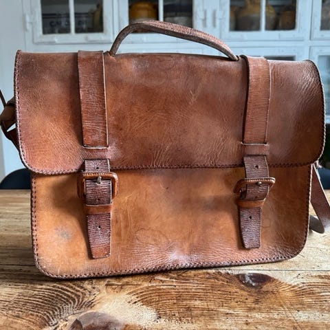 Gammeldags skoletaske i brunt læder i rigtig fin stand. Den er helt ren indvendig. Den er 32 cm høj og cirka 45 cm bred. Den kan fx bruges til en bærbar computer.