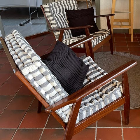 Til begge stole medfølger originale puder (De sidste billeder) uden betræk. Puderne med det hvide betræk er købt i Ikea, og sælges også med.