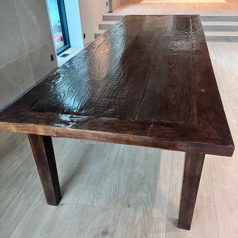Efter 40 års brug trænger det til at blive slebet/høvlet. Bordplade er 40mm.