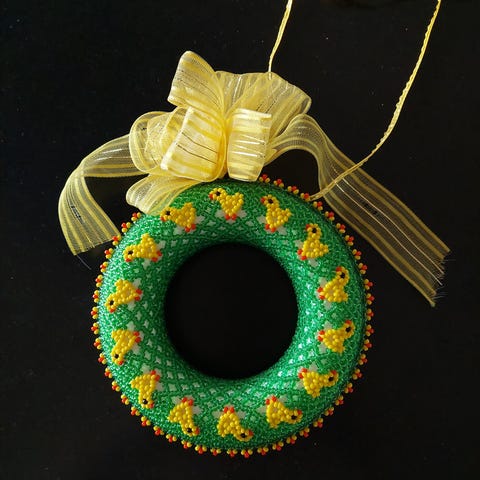 En smuk krans til fire lys med flotte perler i retrostil. Kransen er 23 cm i diameter og kæderne til ophæng har en længde på 44 cm. Kan pyntes til jul og bruges som adventskrans.
