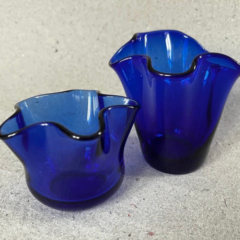 2 stk. blå lysestager til fyrfad lys, Højde 6 cm. Diam. 6 cm