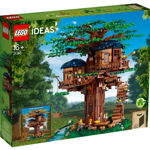 Det har en landskabsbase og 3 LEGO træhushytter - et soveværelse, badeværelse og børneværelse.