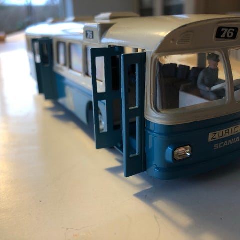 Tekno Denmark Scania CR 76 bus i schweiziske PTT's gule/grå farver, bussen er ommalet, men superflot lavet