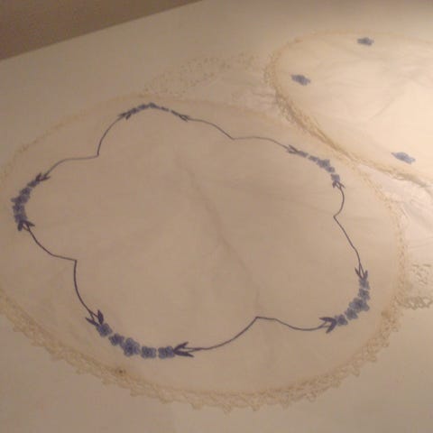 strikket rund dug fremstillet i farven ecru. Dugen har et mønster med åbne og lukkede masker, der danner et dekorativt, cirkulært design. Egnet til brug som bordpynt eller dekoration.