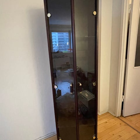 Meget smukt vitrineskab i marhogni med lys (de to nedeste skal have nye pærer) smukt dybdegående glød i træet. Vejer en del. Skal hentes på adressen.