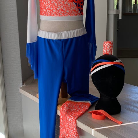 Discodragt, helt ny fra Discodragter.dk, str. 8-10 år ca., uden glimmer. Neonpink lycra top med spiralfrynser på forstykke. Bukser i tyrkis lycra.