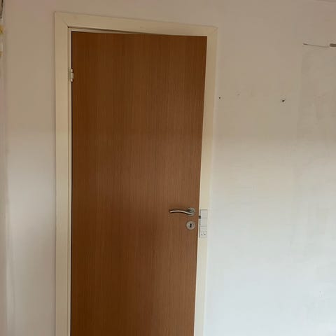 Vi har en dør til overs efter et renoveringsprojekt. En brun trædør i massiv træ, muligvis teaktræ. Den er lakeret.