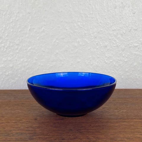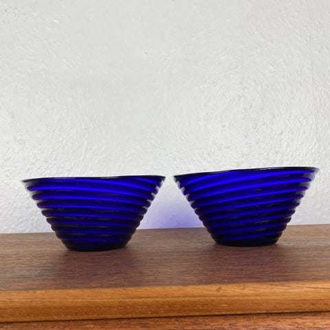 Stor blå glasskåle. Skåle har et elegant, spiralformet design. Perfekte til servering eller som dekorative elementer i hjemmet.