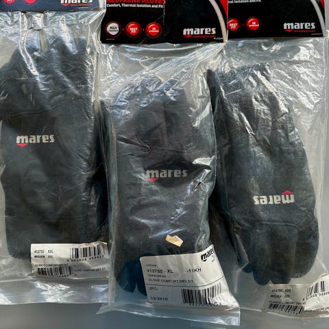 Dykkerhandsker XL 6,5mm neopren. To af mærket Mares og en af Oceanic. Pris 50kr. pr par.