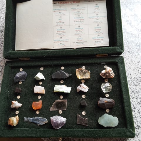 Sælger en samling af forskellige krystaller og sten – både rå, slebne og polerede. Inkluderer blandt andet klar kvarts, rosakvarts, ørkenrose, geoder og farverige tromlede sten i flot glasæske. Perfekt til samlere eller dekoration