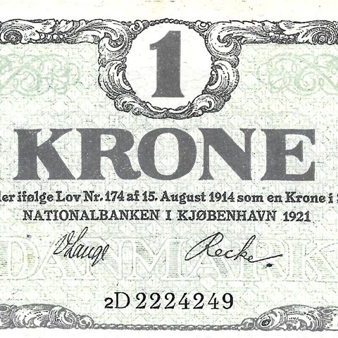 Danmark, sedler, 1, 1921, Bemærk lille skade i øverst højre hjørne