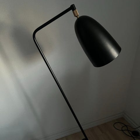 Elegant G-10 gulvlampe fra GUBI, udført i metal og børstet messing. Lampen har farven Black Rough og et tidløst, ikonisk udtryk designet af Greta M. Grossman.