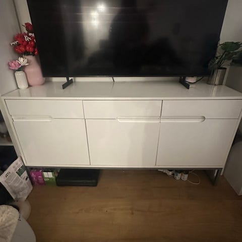 Der er en mindre skade bag på TV skænken, som der ikke er særlig synlig.