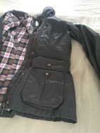 Jakke, str. 34, H & M, Mørk grå, Bomuld , God men brugt, Oilskins agtig jakke med lynlås og trykknapper. Godt med lommer og lækkert ternet foer.