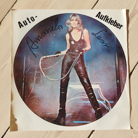 Stort rundt klistermærke fra 70'erne med sangerinden Linda Ronstadt på rulleskøjter.