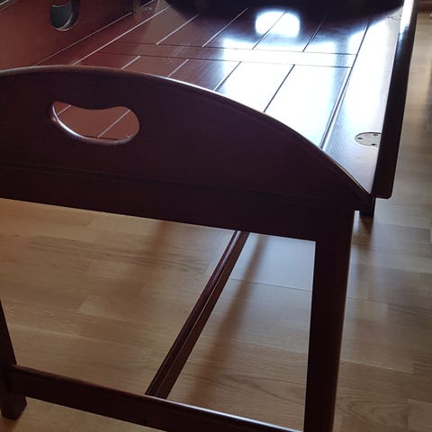 Dette spændende bord har en hængslet tillægsplade, som nemt giver ekstra 40 cm bordplade, da man helt enkelt trækker bordpladen fra den ene side - så hele pladen hviler på stellet. Det lidt utydelige mærke viser MADE IN DENMARK - 06 DEC 1978 - RY møbler (i en trekant). 120 cm lang x 80 cm bred , 64 cm høj og tillægsplade/klap 40 cm.