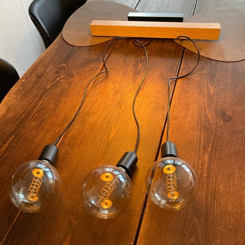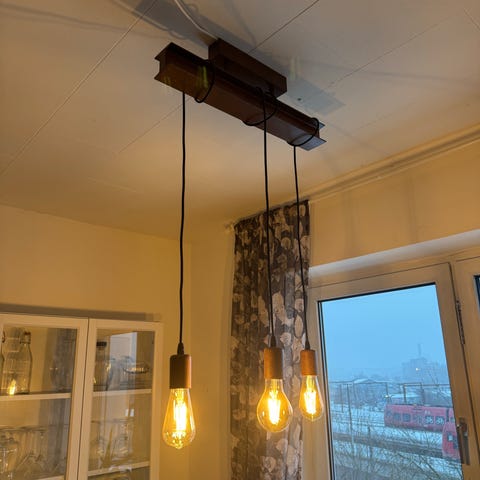 Sælger denne super flotte eglo langbordspendel Townshend med 4 sokle, sorte ledninger og de 4 Vintage pærer følger med gratis. Den har kun hængt oppe ca 1 år, og passer ikke ind det nye sted desværre.