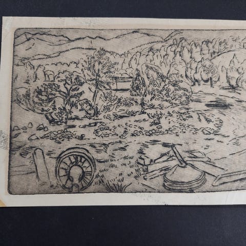 66*60. Træstudie. Anerkendt grafiker. Lidt "tåge" midt i motivet, men svært at se jf sidste billede.