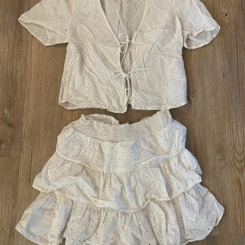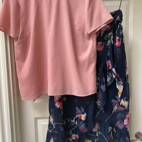 Sødt og komfortabelt sommersæt i rød/blå med nederdel i str.40 og top i 38 (størrelsessvarende). Nederdelen går ned over knæene.