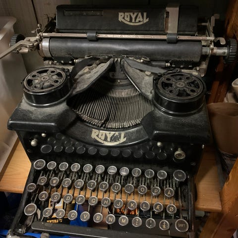 Royal Model 10, en af de mest ikoniske skrivemaskiner fra Royal Typewriter Company. Ud fra designet – især med de runde taster, det tunge støbejernskabinet og vinduerne i siden (som nogle modeller har) – kan den dateres til perioden ca. 1914–1930'erne.
