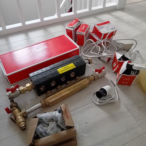 1 stk. Danfoss icon2 gulvvarrme styring (460970535) og 5 stk. Danfoss trådløs rumtermostat ( 460970440) og 2 stk. Danfoss trådløs rumtermostat mes infrarød gulvføler ( 460970450)