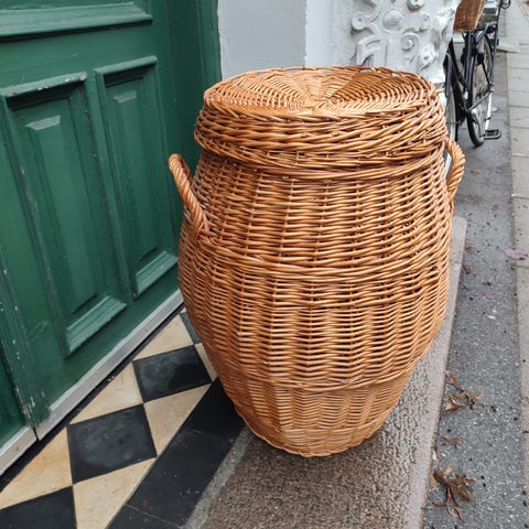 Vasketøjskurv, opbevarings kurv i flet, 62 cm høj og 34 cm i diameter ved hul og ca 50 cm i diameter hvor den er bredest.