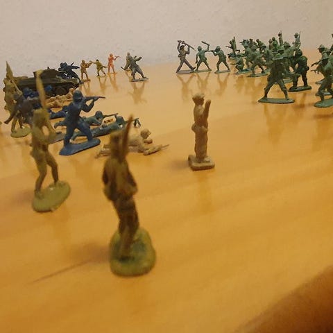 Legetøj, Tin soldater, To engelske og en russisk. 4 cm høje. Fra 40'erne. Alle tre for 80kr