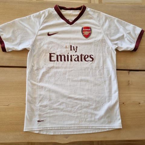 Arsenal-trøje far 2006. Størrelsesmærket er slidt væk, så størrelsen kan ikke ses. Men den måler 65 i længden foran, 68 i længden bagpå, 49 i bredden - så jeg tænker den fitter en SMALL eller XS. Sammenlign evt. målene med en af dine egne.