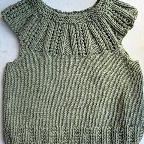 Gul strik vest. Hjemmelavet. Så den har ikke et mærke. Der er vedlagt mål på billederne.