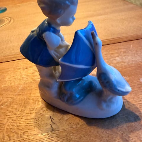 Figur i porcelæn af en pige med paraply og gås. Figuren er i blå og hvide farver og viser en pige iført kjole med paraply, stående på en oval base sammen med gås.