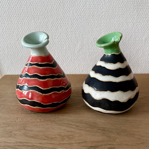 2 stk 60’er keramik emner, muligvis vaser, men med åben i bund. Har også underskål som de står på. Fe står flot med tørrede blomster.