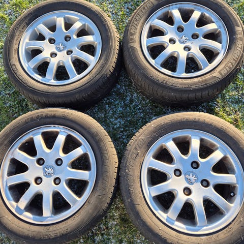 Original fælge med dæk til peugeot med ok mønster på dækkene.