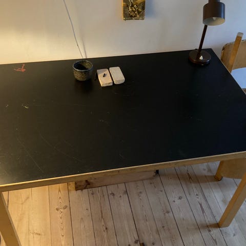 Konsolbord i blå linoleum med rød kant og sortbejdsede egetræ. Kan installeres i ønsket højde. Købt i Paustian i 2019 for 5450 kr